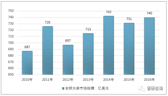 由于市場需求與價格的變動,近年來全球水泵產(chǎn)業(yè)市場規(guī)模呈現(xiàn)一定的波動性,2016年全球水泵產(chǎn)業(yè)市場規(guī)模達740億美元,較2015年的731億美元增長1.24%。
