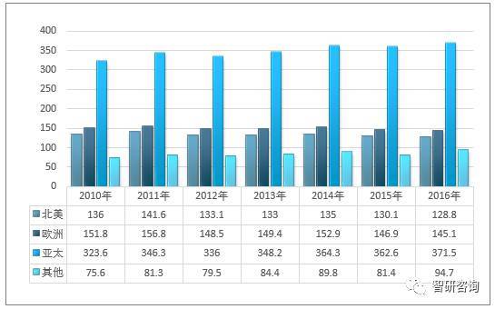 2010-2016年全球水泵市場區(qū)域分布(億美元)